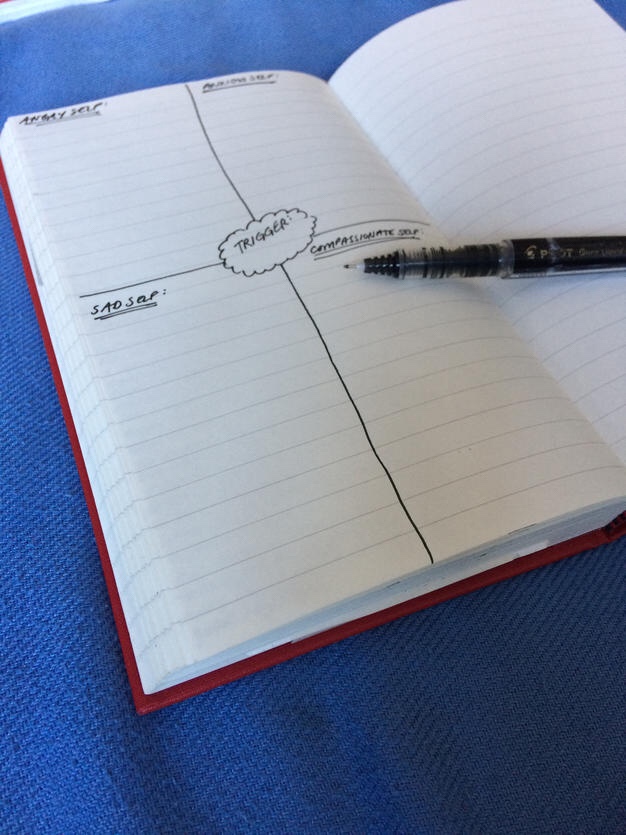 2. Divide the space around your trigger into four equally-sized sections. Label these Angry Self, Anxious Self, Sad Self, and Compassionate Self.
